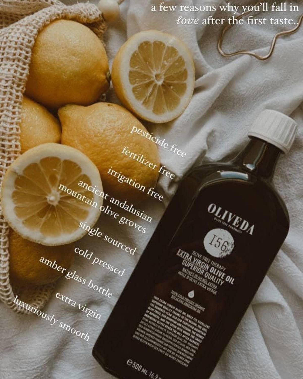 Die ganze Kraft vom Jungbrunnen Olivenbaum in der Flasche. Seine hochwertige Qualität verdankt das Oliveda Olivenöl den dafür entwickelten Produktionsstandards. Diese haben etwas mit dem Reifegrad, der Erntetechnik und der Geschwindigkeit zu tun, mit der die Arbequina Oliven nach der Ernte die Mühle erreichen (in weniger als 8 Stunden) und selbstverständlich damit, mit wieviel Sorgfalt die nochmals sortierten und gewaschenen Oliven dann gepresst werden. Der herausragenden Geschmack begeistert durch eine genussvolle Komposition aus reifen Äpfeln, grüner Oliven, wilden Wiesenkräutern und süßen Mandeln, vollendet mit charmant blumigen Tönen.