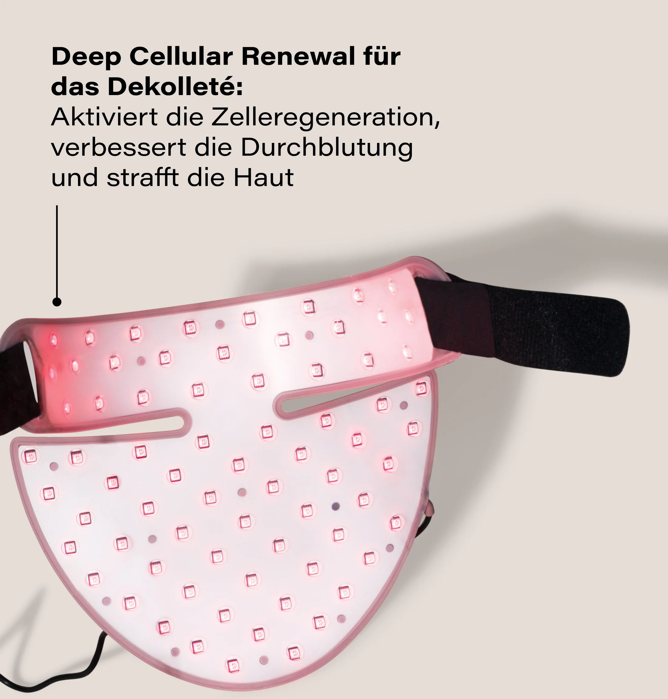 Hochwertige LED Décolleté Mask für Zuhause: mit vier wirksamen Modi für einen sichtbaren Slow-Aging-Effekt* im Dekolleté- und Halsbereich. Geförderte Kollagenbildung, verbesserte Hautelastizität und -regeneration wirken gegen Falten und Hyperpigmentation. Die Wellenlängen dringen tief in die Hautschichten ein und bieten so eine professionelle, sichere und schmerzfreie Behandlung Zuhause – individuell auf deine Bedürfnisse einstellbar und ohne Risiken.
